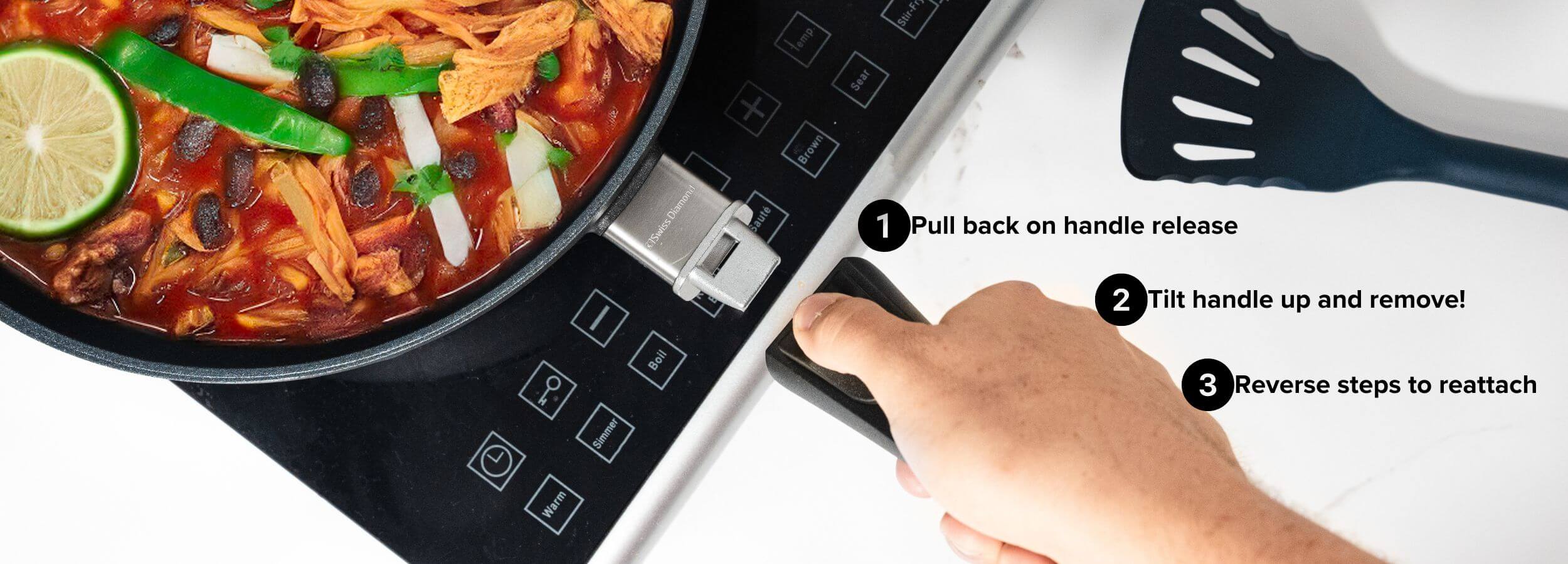 Our detachable handle cookware is the newest addition to the Swiss Diamond XD Collection, designed to offer both space-saving convenience and premium performance. Ideal for compact living spaces like condos, RVs, and boats, these pans fit perfectly into drawer or roller cabinets, freeing up valuable kitchen space.