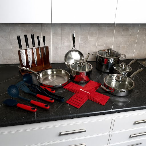 Option 1: This full kitchen upgrade has all the tools and knives you'd ever need, along with a 10-Piece set of our signature XD nonstick cookware. With a nonstick coating full of diamonds on a cast aluminum body, these pans give you pro-chef results and make cleanup a breeze! | Option 2: Upgrade your entire kitchen with everything you need, from top-quality knives and tools to a 10-piece set of our elegant stainless steel cookware. Built with a durable 5-ply stainless steel body, these pots and pans deliver perfectly even cooking results and a perfect sear every time. Sleek and long-lasting, they’re designed to bring professional performance and modern style to your kitchen! |